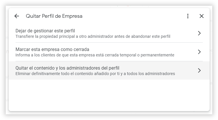 Este nombre da pie a confusión, ya que si utilizas esta opción lo que estarás haciendo es quitar esa empresa de tu panel de administración y por lo tanto dejarás de tener acceso a ella, pero seguirá apareciendo en Google y Google Maps cómo un negocio abierto y funcional.